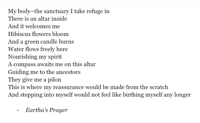 i am so grateful to Kaila and Eartha for taking the time to process this prompt and offering their pieces to this inaugural collection. i personally did not think i’d see this project through to the end, but their contributions inspired me to push past my own doubt and produce something rather than nothing.